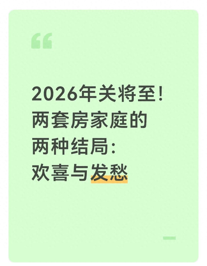 总结一下,2026年关将至,两套房家庭的两种结局,本质是“选对资产”与“选错资产”、“理性配置”与“盲目跟风”的差异。房地产市场的黄金时代虽然结束了,但优质资产的价值时代才刚刚开始。不管是欢喜还是发愁,都只是阶段性的状态,关键是要读懂市场趋势和政策导向,理性调整资产结构,让房子真正为家庭生活服务,而不是成为负担。